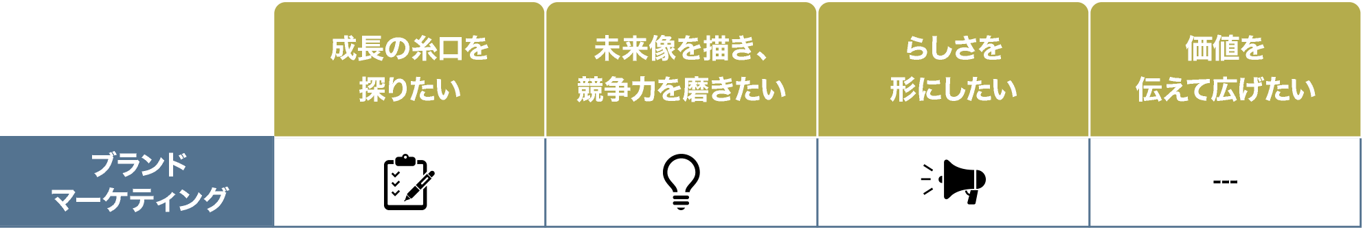 市場や顧客の変化を見極め、ブランドを進化させるアプローチを提供するのがブランドマーケティングです。各種ブランディングの実行に際して、このアプローチが競争力の強化と持続的な成長を支えます。